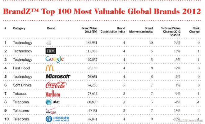 The BrandZ report lists Apple’s brand value for 2012 at just under $183 billion, representing a 19% year-over-year increase.