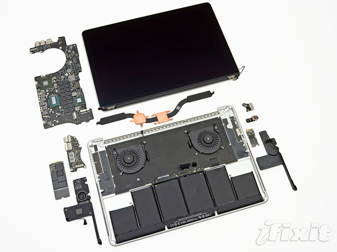 The major problem areas are the 95Wh batteries and the Retina display that are sealed and absolutely non-user replaceable. Even iFixit who usually manage to get their way in decided to refrain from taking these parts apart in order to not damage them. The display in particular is tricky because there is no protective glass on top of it and the whole thing is sealed inside the lid, along with the Bluetooth and Wi-Fi antennas.